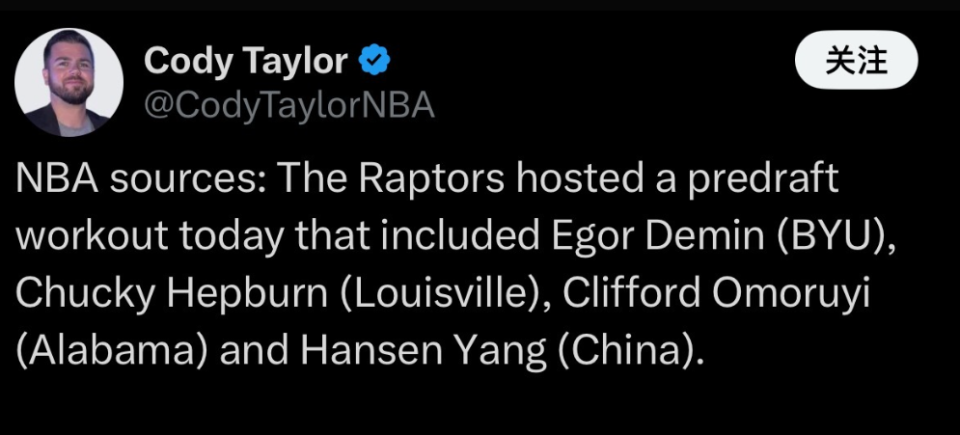 杨瀚森目前的选秀行情看涨,预测顺位一般在首轮末次轮初,猛龙的39号签是有机会选中杨瀚森的位置,让我们祝福瀚森试训表现出色,获得更多球队的青睐。